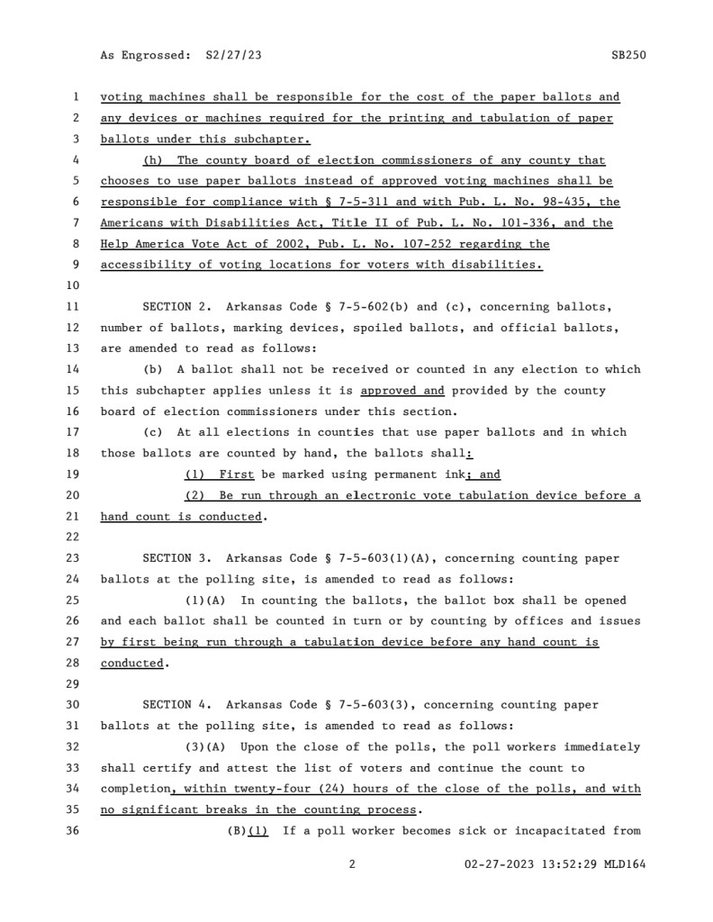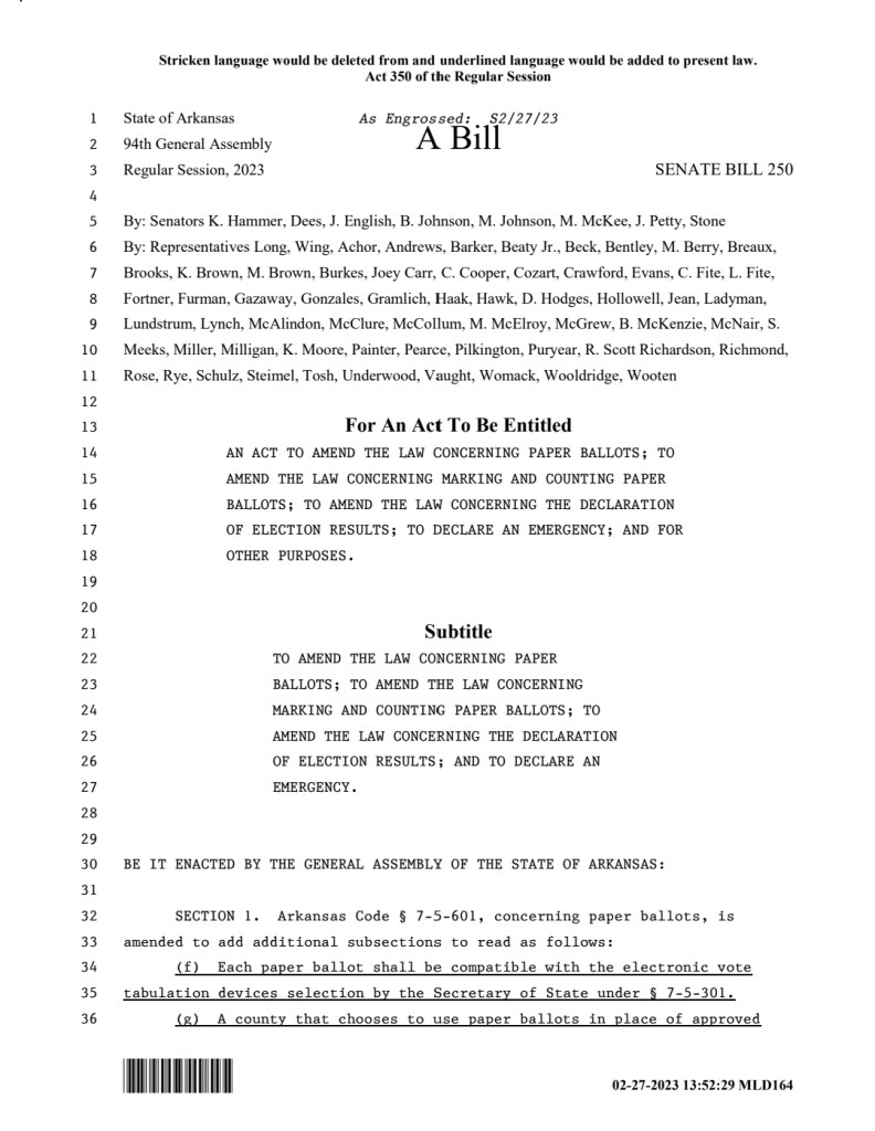 The law now states that every county in Arkansas must use ballots that can be counted using a vote-counting machine that has been approved by Arkansas’ Secretary of State. However, the law stipulates that a county that chooses ballots that are not compatible with the Secretary of State’s chosen machine(s) must itself pay for the entire cost of those ballots and any machines necessary for printing or counting those ballots.
