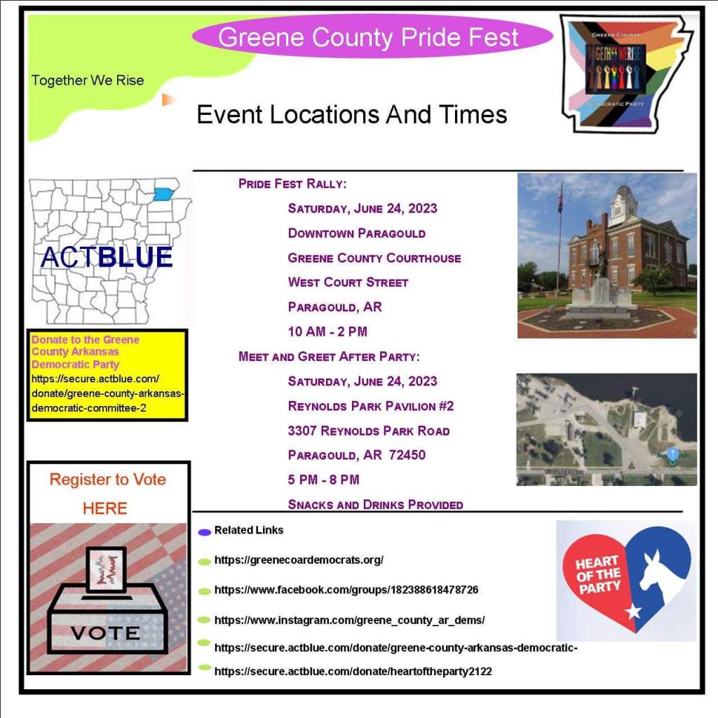 All are welcome to attend tonight’s Greene County, AR, Democratic Party monthly meeting. We hope to see you in the Legacy Room of the Greene County Library at 6 p.m.